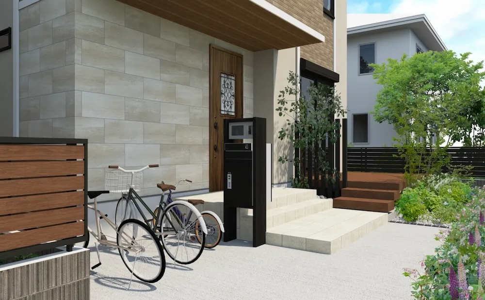 駐車場1台分のコンクリート舗装や簡易的な門柱(表札・ポスト・インターホン)、敷地の一部を砂利敷きにする程度で、フェンスや塀を省略したオープン外構になるケースが多く見られます。