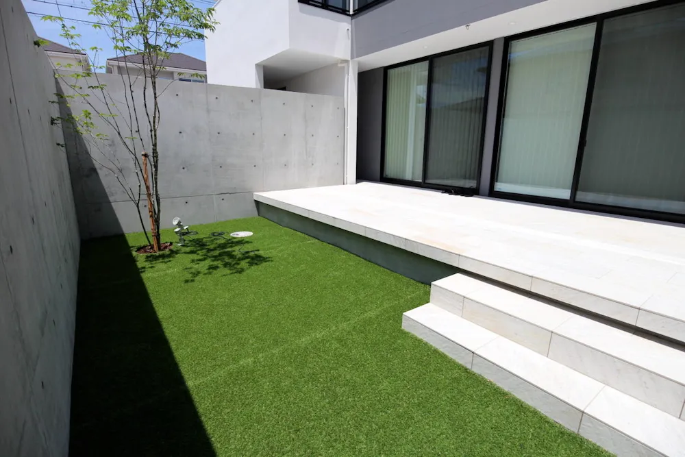また、花壇はベンチ代わりにもなる少し高めの腰壁風に作り、内部に人工芝を敷いて雑草対策と実用性を両立させました。