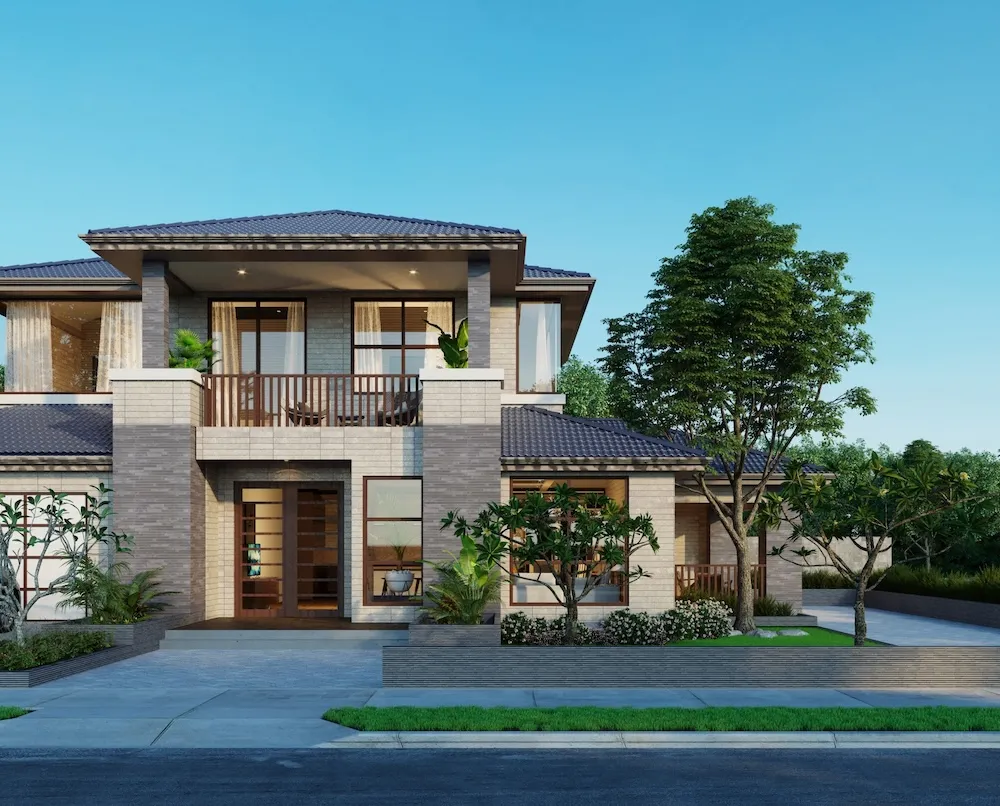 外構では広いウッドデッキやタイルテラス、ヤシの木などエキゾチックな植栽を配し、水景(噴水や小さな池)を加えることで非日常的で癒しのある空間を演出できます。