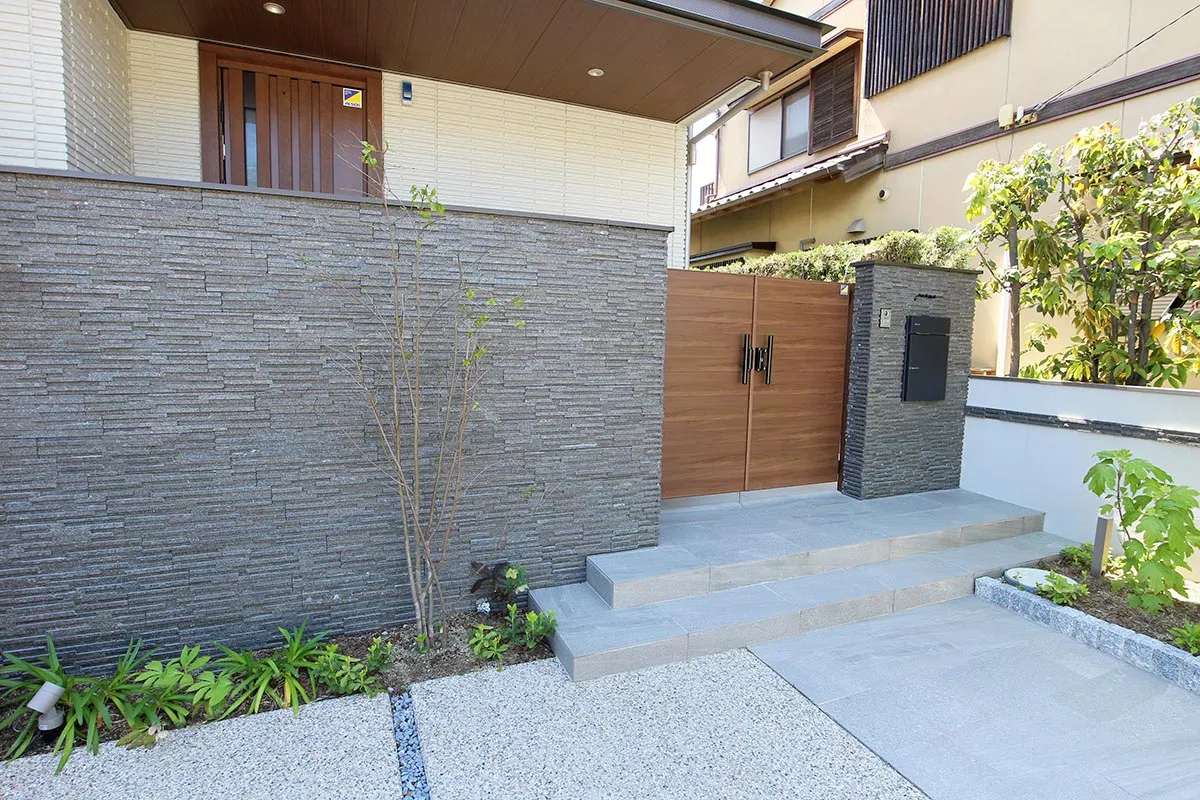 タイル素材をふんだんに使い、重厚で高級感のあるクローズ外構に仕上げた事例です。